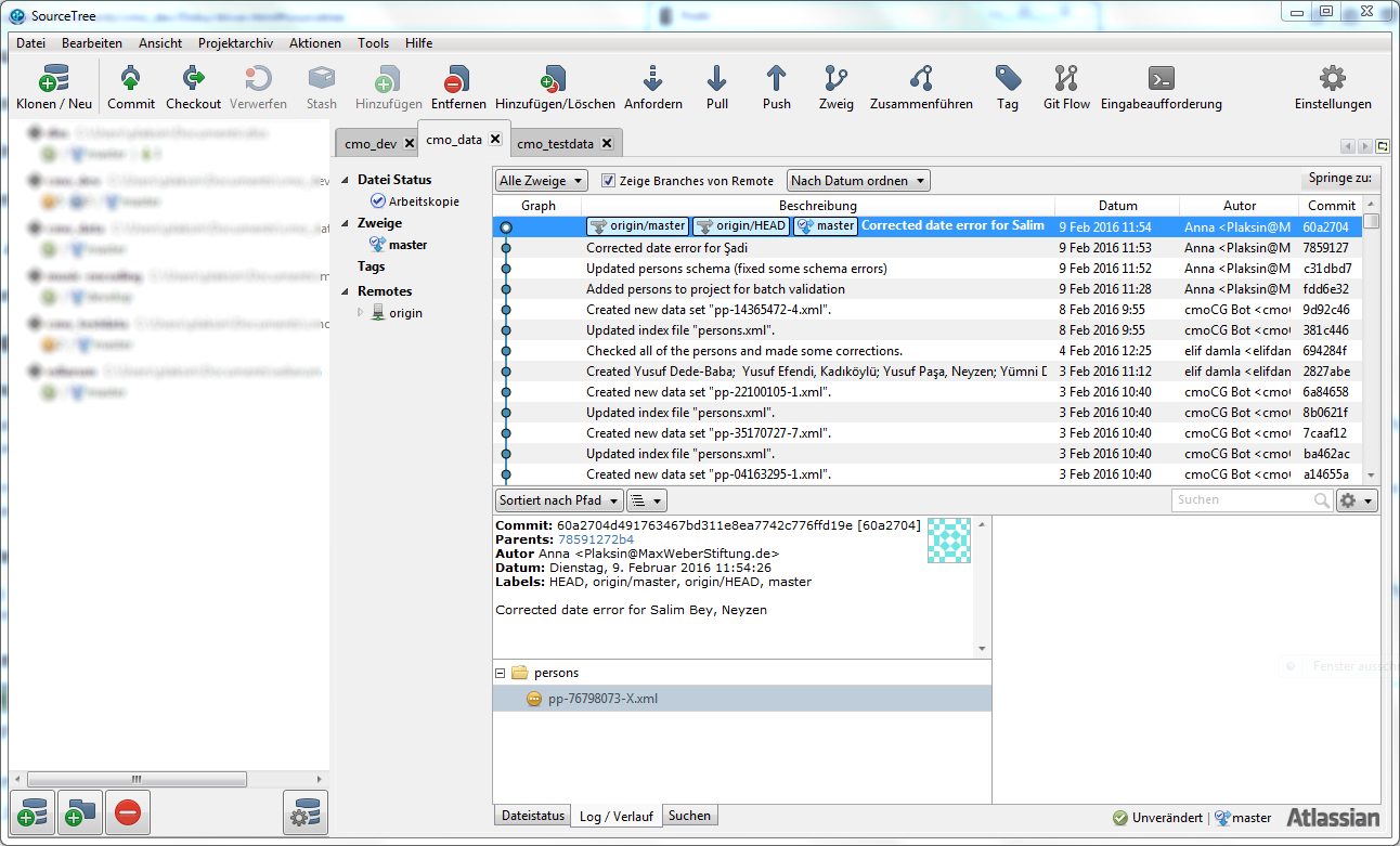 The window of SourceTree consists of three parts: the button bar on the top, the list of repositories on the left, and the overview of an opened repository on the right. When you start the application you will see the overview of the branches of the current repository. This view consists of the list of commits with description, date, author and commit number and a detailed view of a commit. The detailed view of a marked commit will be shown under the list. It contains the infos of the commit, the affected files and a short summary of the stored changes.