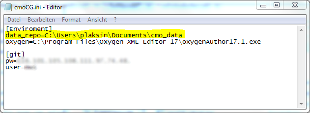 The top part of the file below "[Enviroment]" contains two directories, the path to your local working directory (see About Git) and the installation path of your oXygen Author executable. If you didn't change any settings within the installation process of oXygen, this path should work without any modifications.