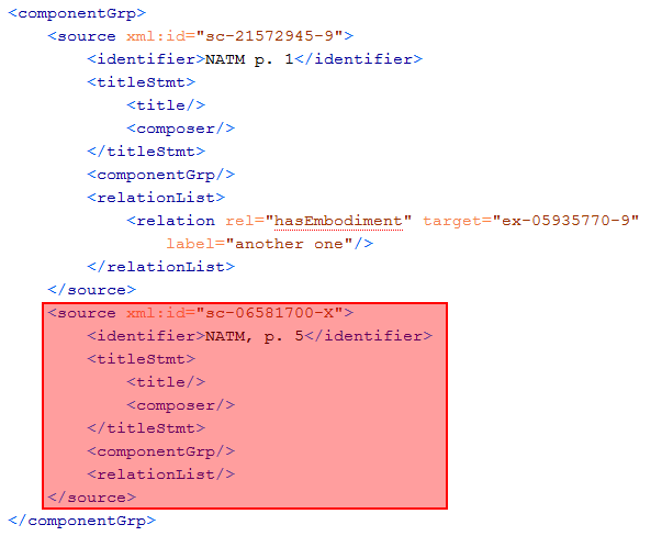 To navigate through the plain XML, look out for the indentions. Every opening and closing element on the same hierarchy is usually recognizable by the same amount of indentions. In the example above you see the parenting <componentGrp> element with two <source> elements inside. Every of them has a single xml:id, which is the technical ID of it. Identify the the dataset by this ID and delete everything from the opening <source xml:id="sc-06581700-X"> to the closing <source>.