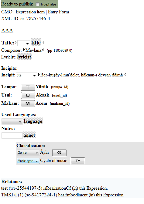 Here also one entry is a single <item> element with depending child elements. Every entry has its own ID as xml:id attribute. These IDs are generated like other technical IDs in the database. The first two letters mark the type of ID, in this example it is an ID for a makam.