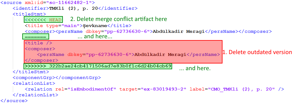 The conflict begins at the <<<<<<< HEAD and ends with >>>>>>> 322b2ae24cb4171506ad7e83b0f1c6d24b04cb69. Both versions of the file are stored in this artifact, devided by =======. The lines above the divisor are the current version of the repository, the lines underneath it are the version from the current editor's computer which should be pushed. Now, you have to decide which version you want to keep and which you want to delete. In that particular case, we keep the version from the repository (the upper one) because it contains the title and the one below only the composer. The first step is now, to delete the lines we want to delete. Then you have to delete the merge conflict markers. After that procedure, the source component should look like this: