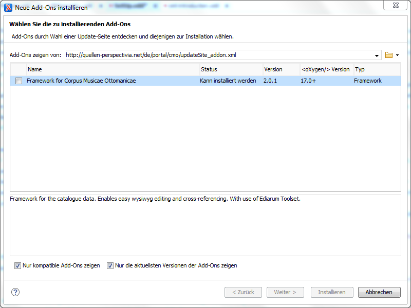 To install the framework add-on click on the checkbox in the list an proceed. In the next step you have to accept the (on exsiting) license agreements by checking the box on the bottom of the window and proceed.